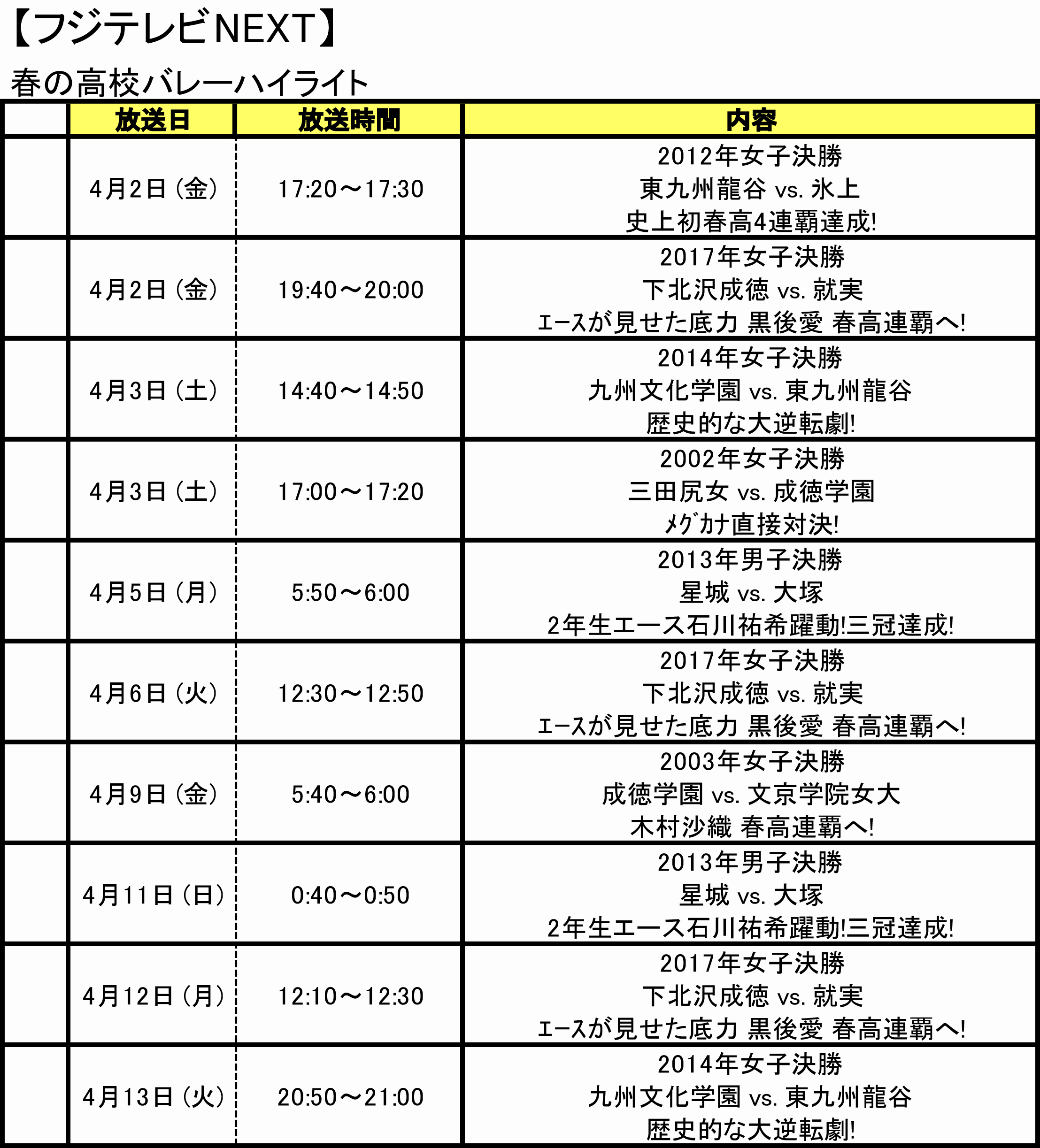 4月後半のバレーボールテレビ番組をご紹介。4月1日(木)〜4月15日(木)放送予定のテレビ番組をしっかりチェック!※放送…