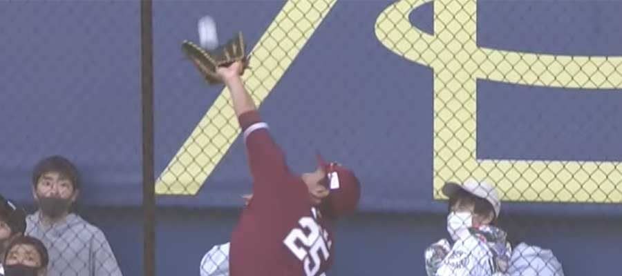 楽天1点リードの9回1死二塁のピンチ。一打同点のピンチで、ロッテ山口の打球は右中間へ高々と上がった。右翼の田中和は打球の行方を追いながら、フェンスに直撃する直前の打球をキャッチ。打った山口は思わず天を仰ぐほどの好守だった。