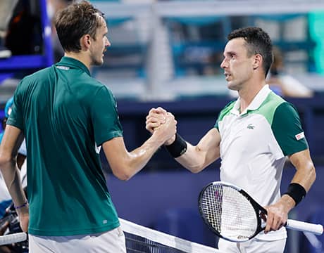 男子テニスのマイアミ・オープン(アメリカ/マイアミ、ハード、ATP1000)は31日、シングルス準々決勝が行われ、第7シードのR・バウティスタ=アグ(スペイン)が第1シードのD・メドベージェフ(ロシア)を6-4, 6-2のストレートで破り、大会初のベスト4進出を果たした。