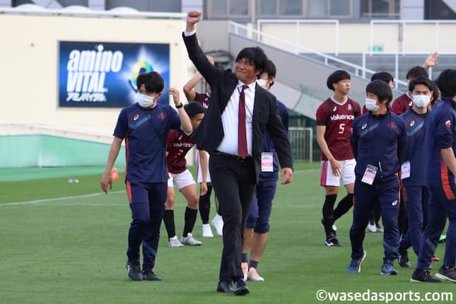 とても良い入りができたというところは狙い通りでしたし、この試合を迎えるにあたってチームにとってもまだまだ半信半疑なところがある中で、ああいうスタートを切れたのは大きな勇気になったと思います。苦しい展開になるというか、うまくいかない時間帯が多くなるだろうなとは思っていたので、そこはある意味試合中もポジティブにというか、ネガティブになりすぎないというところは注意深くしていたので、本当に今日初めて出たGKの公文とかはチームに安定感をもたらしていたと思いますし、彼はこの4年目にして初めてメンバーにも入ったし、それこそAチームに上がってきたのもついこの間くらいなので、上川(琢、スポ4=湘南ベルマーレユース)が骨折したり、脳震とうで出られなくなる選手がいたり、チームとしてはGKが難しい状況の中で、公文は練習で一番遅くまで残っていろいろなメンバーのシュートを受け続けてきた選手で、一般受験で入ってきて、そういう選手がピッチに出て、かつ4年生がそういうところで姿勢を示せたというのは、チームにとってはとても大きなことだったと思います。