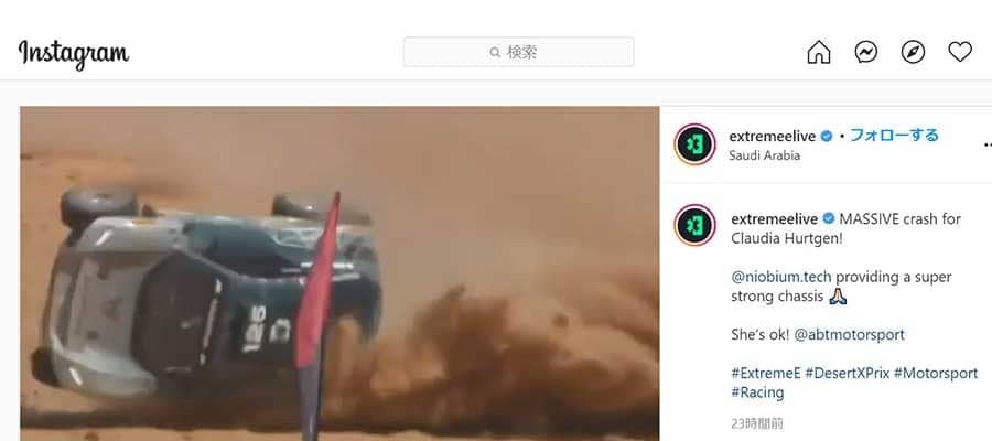 「エクストリームE」の公式インスタグラムは「クラウディア・ヒュルトゲンが大クラッシュ。彼女はOKです!」とつづってヒュルトゲンの無事を伝え、実際の映像を公開。多くの海外ファンが肝を冷やしたようで「オーーノーー」「危ない!」「丈夫な車で良かった」「怖い」「狂気だ」「ヤバいな」などとコメントが寄せられていた。