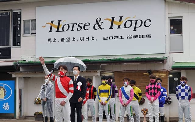 「我々、岩手競馬騎手一同は、2021シーズン『Horse & Hope(ホース アンド ホープ)』のテーマとともに、岩手から全国へ『今を、明日を元気にするエネルギー』を発信できるよう、全身全霊で騎乗することを誓います」