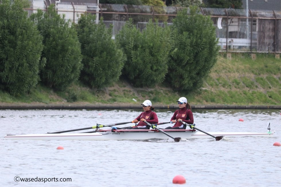 1年生二人を含む舵手なしクォドルプルは、予選が行われなかったため、決勝に初レースとして臨んだ。スタートで他艇に先行されるも、「今日は練習の成果が今までで一番出せた」(猪野日向子、スポ1=岐阜・加茂)と振り返るように、他艇にくらいついた早大。それでもスタートでの差を埋めることはできず、3着でのゴールとなった。