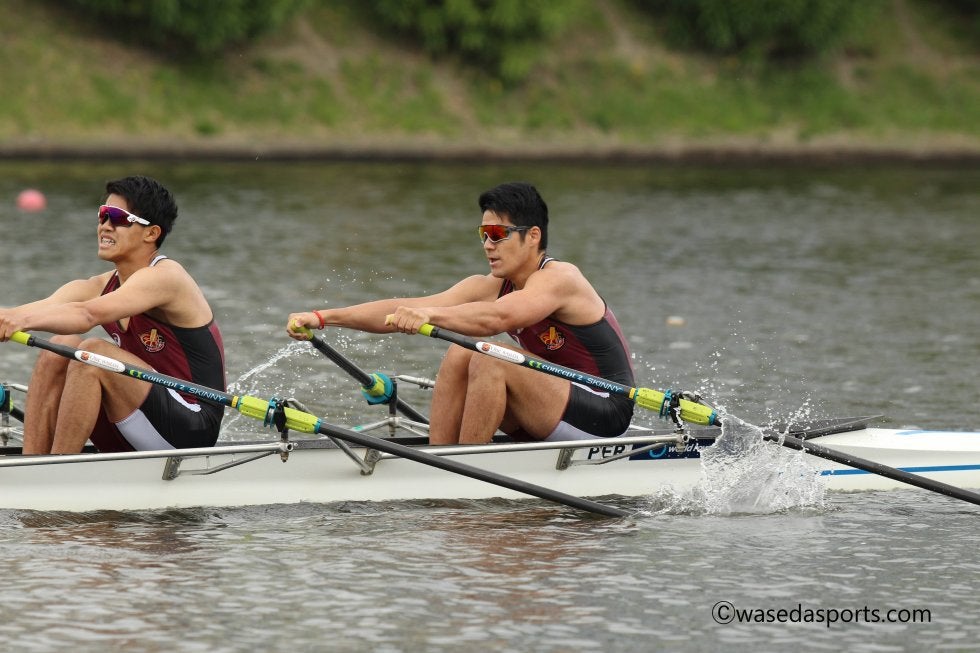 共に大学で初めての試合となった1年生ペアの男子ダブルスカルは順位決定戦(B決勝)に出漕。1日目準決勝の反省から、「500メートルに入る手前からスパートをかけるという作戦」(遠矢陸人、スポ1=熊本大学附属)で挑んだ2人。作戦通りにスパートするも、中盤でつけられていた差を巻き返しきることはできず、4着となった。