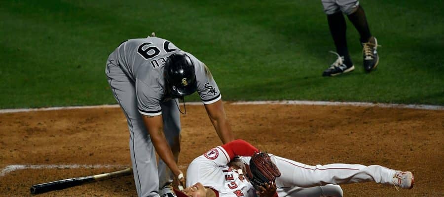 だが、勝利投手の権利がかかった5回。2死満塁のピンチで自らの暴投で失点。さらに続くモンカダの振り逃げと味方のエラーの間に2失点し本塁ベースカバーの際に走者のスライディングを受け転倒。苦悶の表情を見せ降板となった。球場からは悲鳴にも似た声が上がり大谷を心配する姿が見られた。