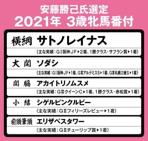 そこで今年も、競走馬の分析に長(た)けた元ジョッキーの安藤勝己氏を直撃。牝馬クラシックに挑む面々の実力について診断・分析をしてもらい、独自の視点による「3歳牝馬番付」を選定してもらった――。