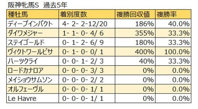 過去5年で最多となる8回の馬券絡みがディープインパクト。次点で3回のステイゴールドが続き、2回がダイワメジャーとなっている。