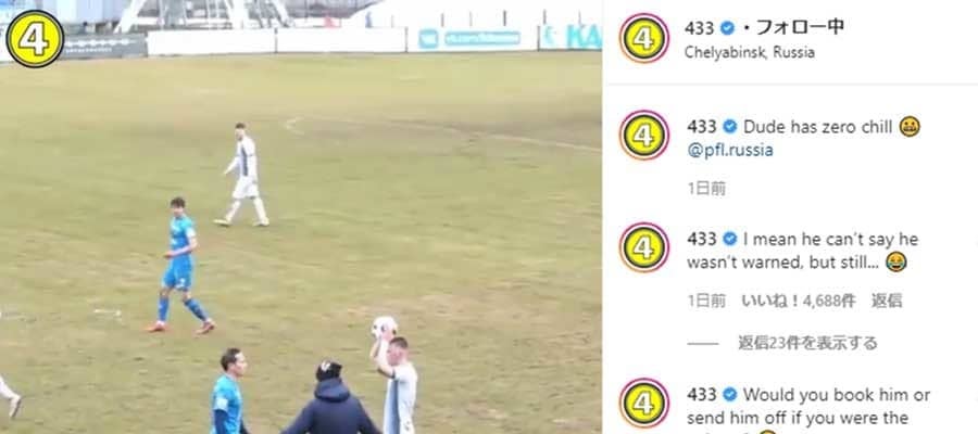 ロシア放送局「ロシアトゥデー」が動画付きで「相手にスローインをぶつけてレッドカードに」と報道。「ロシアの馬鹿げたスローインが話題に。近すぎる位置に立っていた相手を許さなかった」と説明していたが、オランダに本部を置くサッカー専門サイト「433」の公式インスタグラムが「この男はイケていない」と動画を公開すると、海外ファンに笑撃が広がっている。