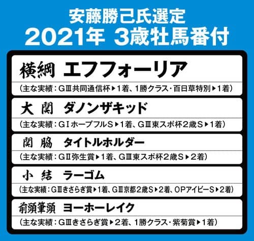 ならば、ここは"プロの目"に頼るのが一番だろう。そこで今回も、競走馬の分析に長(た)けた元ジョッキーの安藤勝己氏に3歳牡馬の実力診断を依頼。牡馬クラシックにおいて、どの馬が有望か検証してもらい、独自の視点による「3歳牡馬番付」を選定してもらった――。